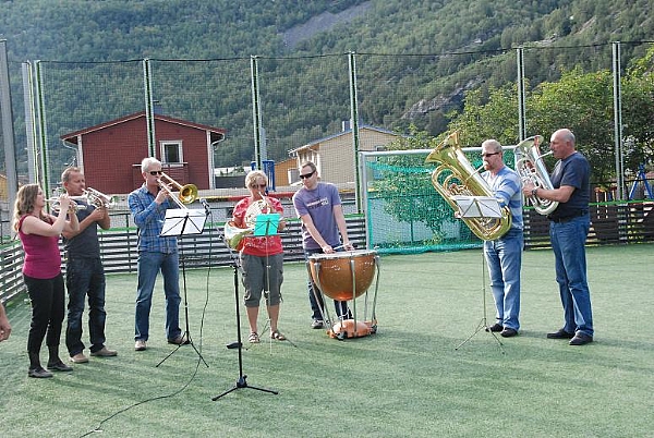 Ei gruppe frå janitsjaren varta opp med fanfare under åpninga av "Olsenbana" tysdag kveld. Det er kjekt at korpset har evne til å stille opp på slike arrangement sjølv om sesongen formelt ikkje er i gang. Vel blåst!